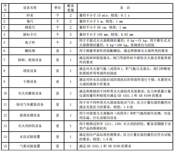 三級消防設施維護保養徐州檢測設備用于滅火器的檢查、維修、更換滅火劑及回收,其設備配備的種類和數量至少應滿足表 3 的要求。