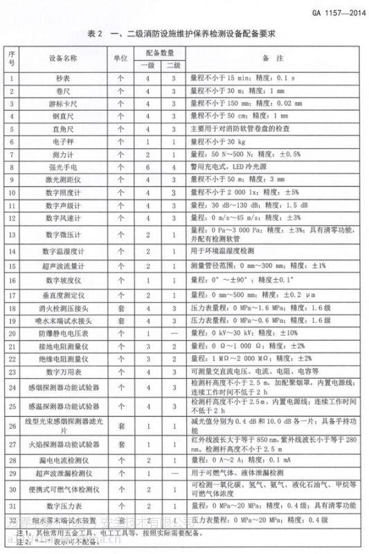 一二級消防設施維護保養徐州檢測設備用于建筑消防設施的維護、保養和檢測,其設備配備的種類和數量至少應滿足表 2 的要求